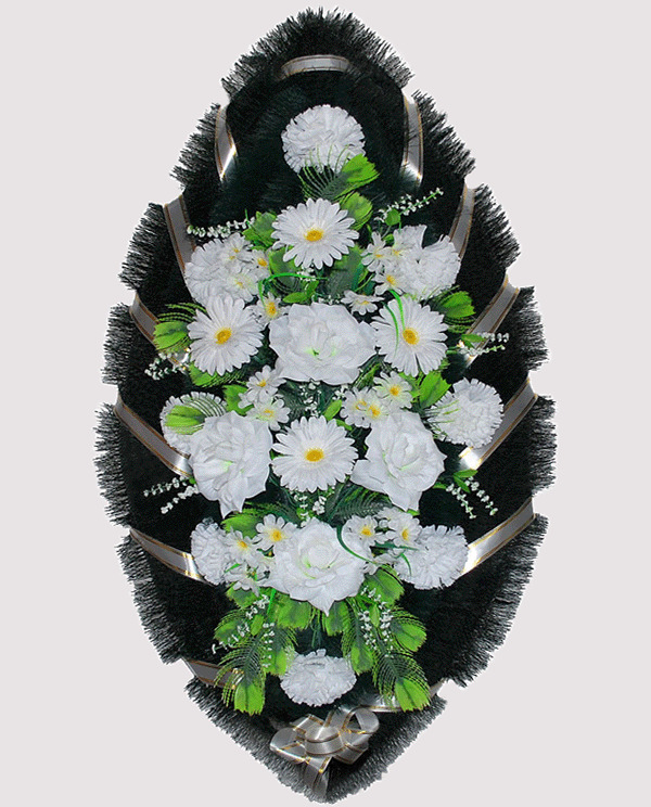 Траурный венок высотой 140 см выполнен в классической овальной форме из качественных искусственных материалов. В составе похоронного венка из роз белоснежные розы, герберы и листья папоротника, выложенные на основании из пышного елового лапника нефритового цвета. Венок обвит лаконичной белой лентой с золотой окантовкой, что придаёт ансамблю изысканности и благородства.