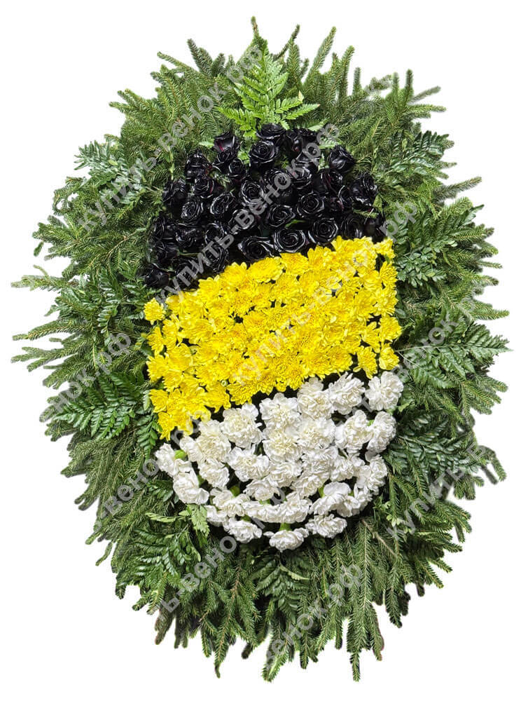 Траурный венок в виде Имперского флага России размером 160 см — это торжественная композиция для прощальной церемонии, выполненная из живых цветов. Черные розы символизируют печаль, желтые хризантемы выражают уважение и светлую память, а белые гвоздики олицетворяют чистоту и искренность. Композицию окружает свежая хвоя, добавляющая венку строгий и величественный вид.