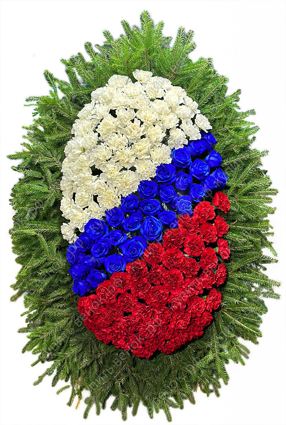 Торжественный венок на возложение премиум класса собирается нашими флористами из свежих цветов на основании из хвойного лапника. Модель венка из живых цветов стилизована под флаг РФ. В середине композиции выложен ряд эффектных синих роз, обрамленных красными и белыми гвоздиками. Венок из живых цветов можно дополнить лентой с индивидуальной надписью.
