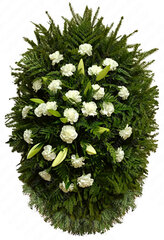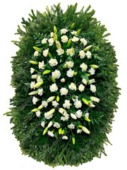 Венок из натуральных живых белых гвоздик и лилий компактного размера. При изготовлении используется оазис, позволяющий поддерживать свежесть цветам в течение долгого времени. Заказать венок из живых цветов возможно с бесплатной доставкой по любому адресу в Москве (морги, кладбища и пр.).
