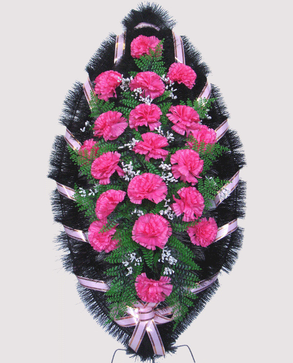Мягкие розовые гвоздики позволят выразить искреннюю нежность и показать светлую скорбь по ушедшему. Композиция выполнена из прочных материалов, поэтому не повредится при транспортировке, не пострадает под воздействием различны погодных условий. Ритуальный венок из искусственных цветов (110 см) подойдет для прощания с мужчиной и женщиной.