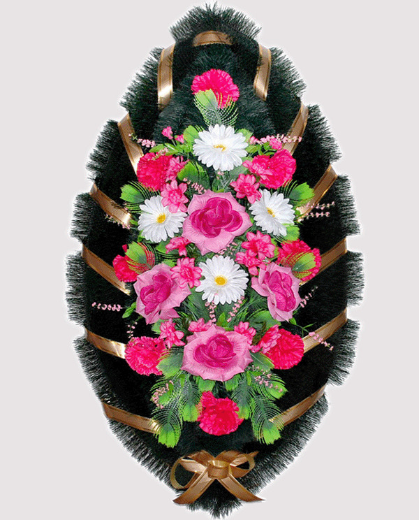 Сочетание роз и гербер в малиново-белых оттенках на фоне густой зеленой хвои создает изящную траурную композицию, достойную стать красивым прощальным жестом. Ритуальный венок из искусственных цветов (110 см) позволит выразить искреннее нежное и теплое отношение к ушедшему, показать, насколько человек был дорог при жизни, и то, что он не будет забыт после смерти. Композиция создана из прочных материалов устойчивых к погодным факторам.