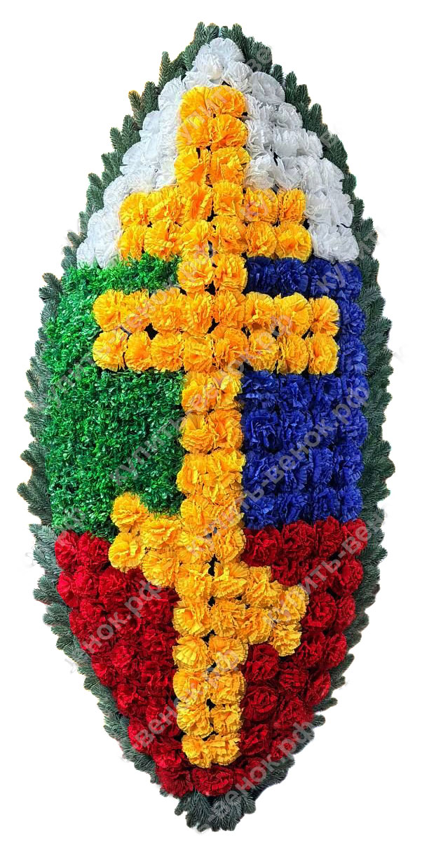 Венок из из искусственной хвои с бархатными гвоздиками выполнен в виде православного креста на фоне российского и болгарского флагов.